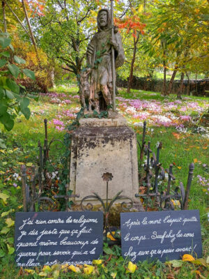 - Le lieu : Saint Roch ! On ne pouvait trouver meilleur nom de localité. Même s’il est plus connu dans le Sud est dont il est originaire, Saint Roch n’en est pas moins, entre autres, patron des pèlerins.