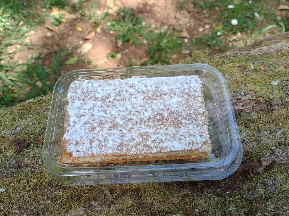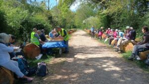 Nous avons ensuite commencé le chemin du retour pour atteindre vers 13 heures un chemin bordé de troncs d’arbres : ceux-ci nous serviront de banc pour nous restaurer d’un pique-nique préparé par nos amis qui nous ont fait la surprise de servir en dessert la délicieuse pâtisserie fabriquée par les moines de l’abbaye de Ligugé : le SCOFA.